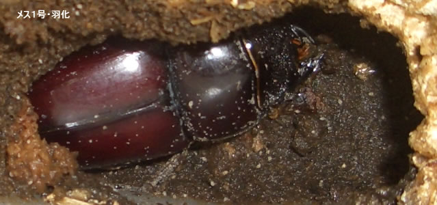 最初のメスが蛹化して、けっこう経つので蛹が茶色くなっているかなと思いフタを開けて覗いて見ると何と孵化しているではないか! 羽はまだ茶色いが羽化してから何日か経っているようである。ピクリとも動かないので死んでいるのかも? と思ったりして、足が曲がっているようにも見えるし...心配になってスプーンでそっとつついてみたら、動いた! ほっと安心したが、足が正常かどうかまではわからない。おそらく孵化後、数日しか経っていないと思われるので、そっとしておく事にした。それにしてもデカイ!親のメスに比べると2回り位デカイ。やはり菌糸ボトルで育てたからWildの親より栄養が良かったのか、もちろんオスほどではないが、なかなかの大きさである。蛹化を確認したのが2/16だったので約23日、3週間強で羽化したことになる。2号メスも蛹化確認後、2週間が経つので見てみたが、やはりカブトの蛹のように茶色くなっていなかった。
